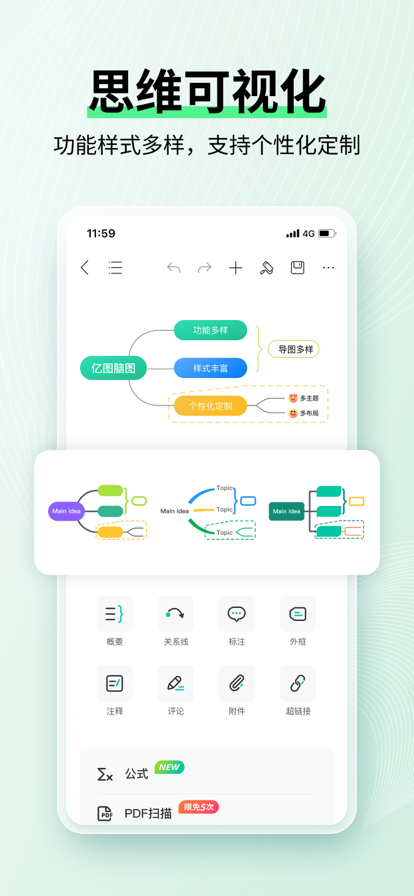 「33种主题」:33款高颜值主题可供挑选,支持效果预览与一键应用,助力思维导图快速焕然一新。
