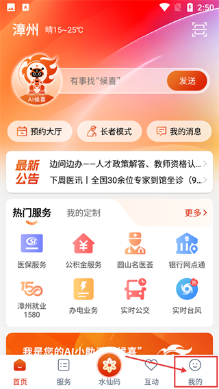 进入漳州通首页后,点击底部导航栏中的【我的】选项,即可进入个人中心页面。