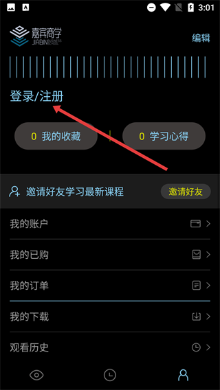 打开【嘉宾商学】的首页后,可查看【课程分类】等板块内容,之后点击页面底部的对应按钮,就能进入与个人相关的功能页面。