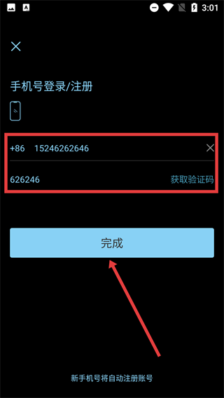 在【手机号登录/注册】页面,输入手机号与验证码后,点击【完成】按钮即可完成登录流程。