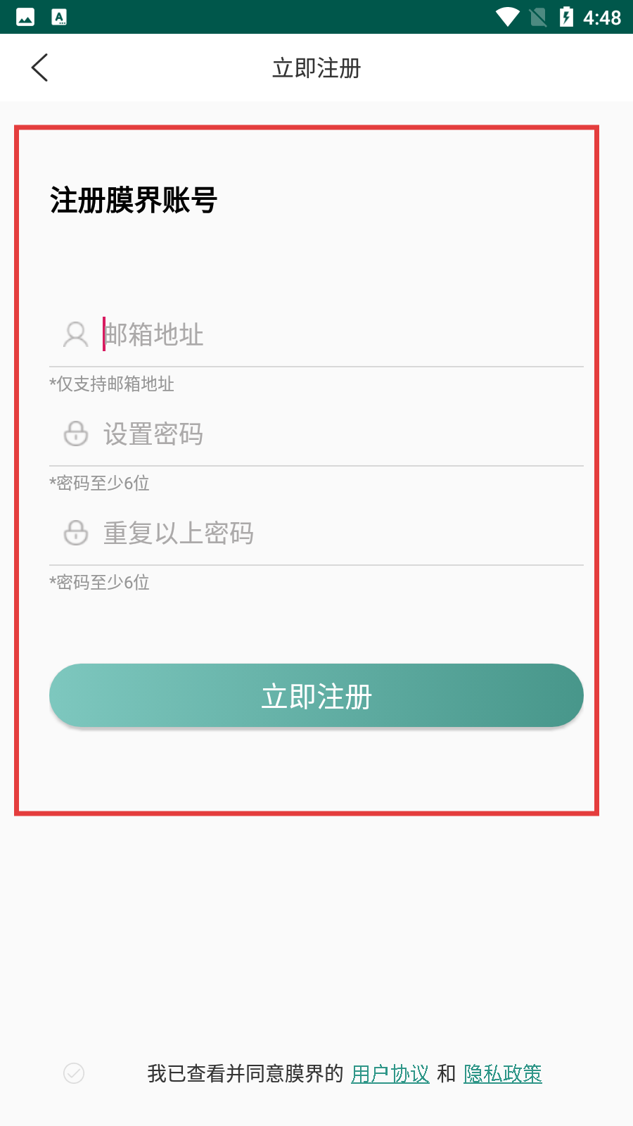 4、进入注册页面后,依次输入邮箱地址、设置密码并再次确认密码,随后点击【立即注册】按钮,即可完成注册操作。