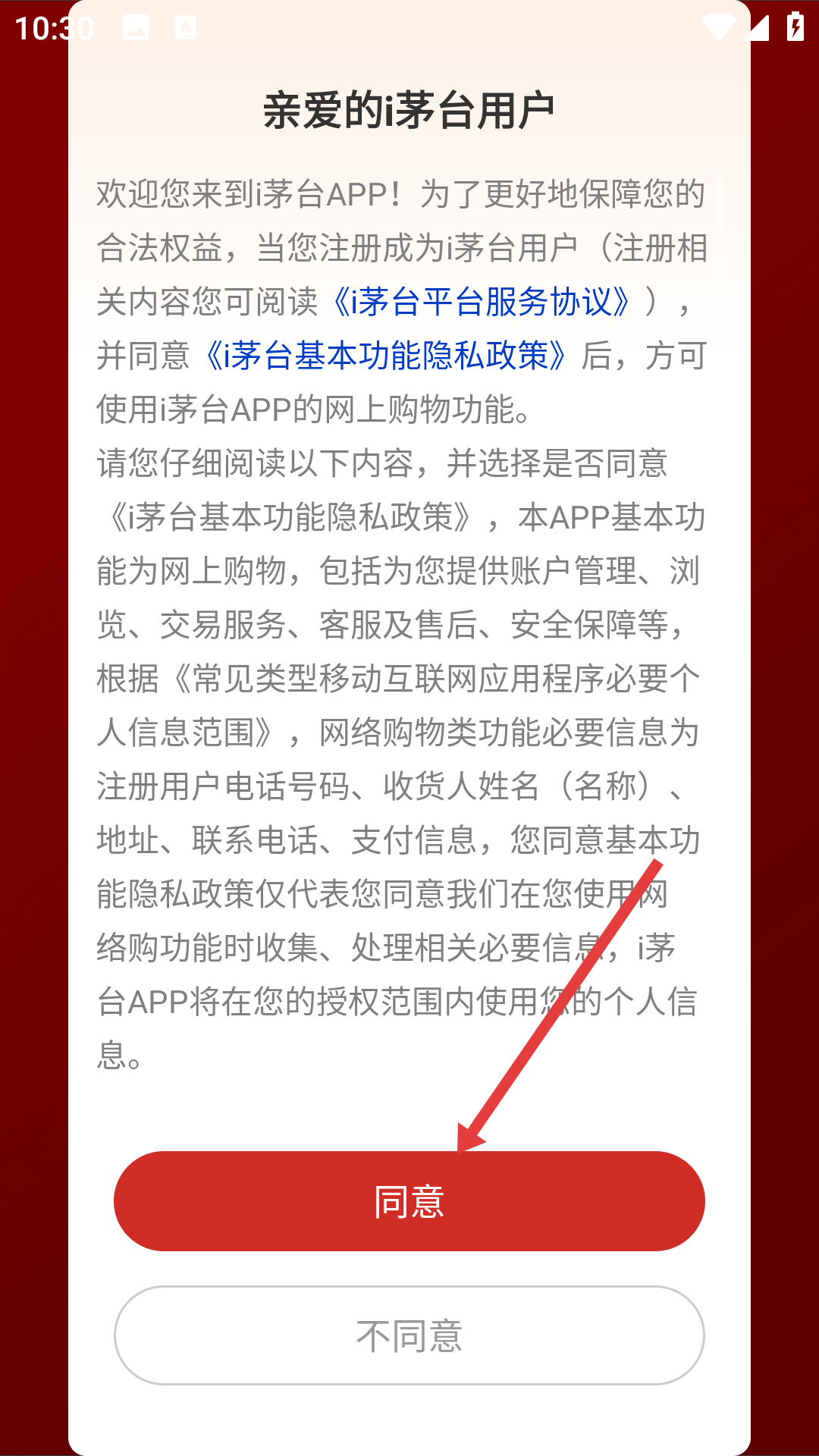 在使用i茅台之前,您需要仔细阅读《i茅台平台服务协议》与《茅台基本功能隐私政策》,并点击【同意】按钮,这样才能启用平台的网上购物功能。