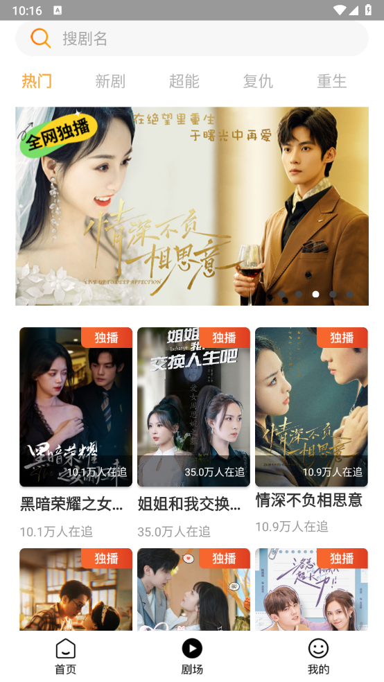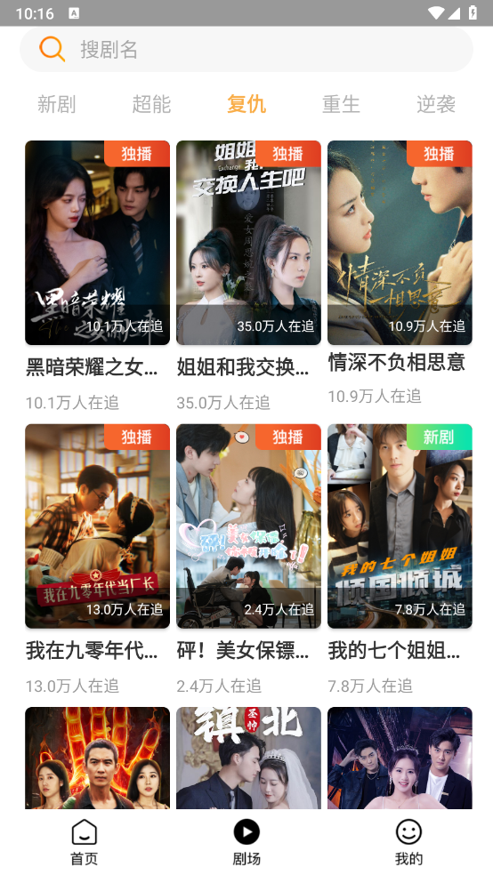 进入首页和剧场页面后,你会发现这里提供了海量短剧资源,涵盖新居、复仇、重生等多种类型。