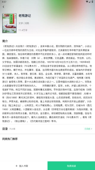 小说的介绍页面,中间区域能够选择章节,底部则可以把这本小说添加到书架,或者直接开始阅读。