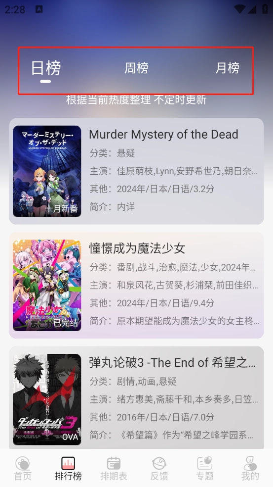 2、排行榜单设有日榜、周榜与月榜,可帮助用户知晓当下最热门的动漫。