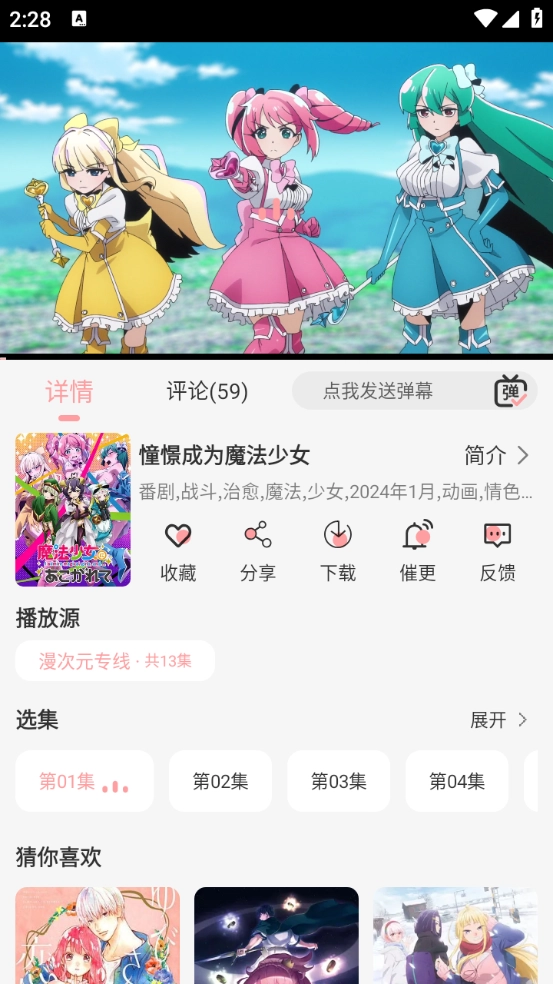5、打开动漫资源后,能够进行发送弹幕、选择集数、切换播放源等操作。