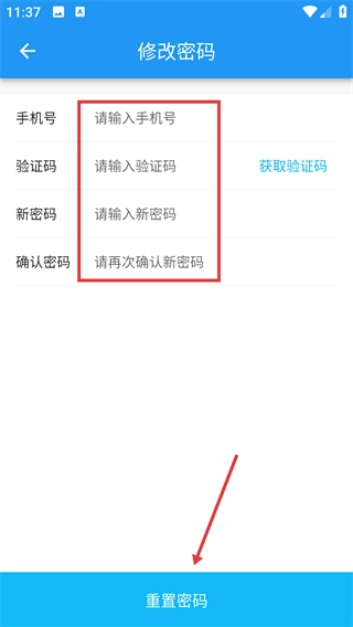 3、进入修改密码页面后,按顺序填写账号信息、验证码以及新密码,所有内容填写完毕后,点击【重置密码】按钮即可。