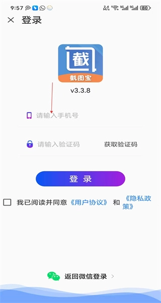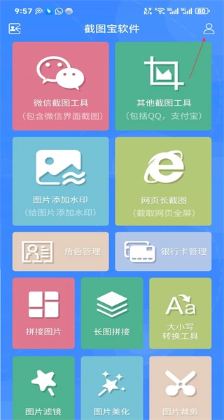 1、启动截图宝应用,进入主界面,这里会呈现微信截图工具等多种功能选项,点击相应区域即可进入个人中心页面。