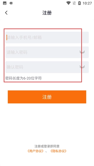2、在注册页面按顺序填写【请输入手机号/邮箱】、满足【6-20位字符】要求的密码与确认密码,信息填写完毕后即可点击注册按钮。