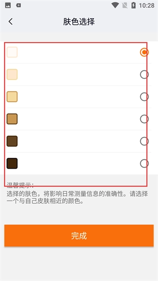 4、进入肤色选择页面后,请挑选与自身肤色最为接近的选项(该选择会对测量准确性产生影响),选好合适的肤色选项后,点击【完成】按钮即可。
