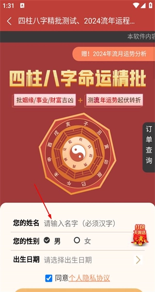 2、进入八字精批页面后,会呈现四柱八字命运精批的相关内容,若要进行运势测算,需填写姓名、性别、出生日期等信息。