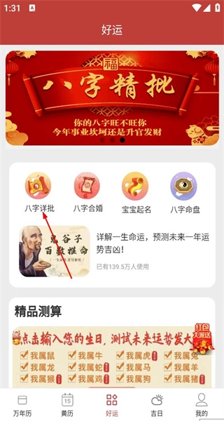 打开软件后,进入“好运”页面,这里会展示八字精批、八字合婚等功能,您可以选择“八字精批”选项,进入对应的测算页面。