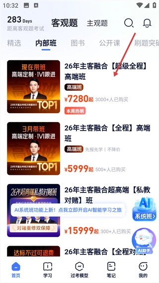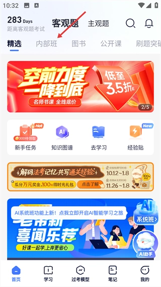 1、在首页,点击顶部的【内部班】标签,即可切换到课程列表页面。