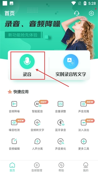 在首页界面点击【录音】按钮,就能进入录音功能页面,还可以查看音频降噪等快捷应用工具。