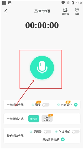 进入录音大师界面后,点击【麦克风图标】就能启动录音,同时还能开启降噪、声音美化之类的辅助功能。