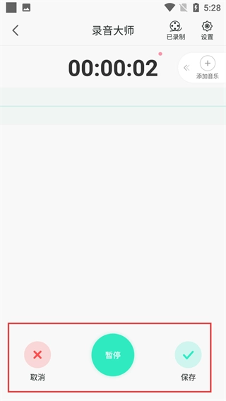 在录音时,你可以借助【取消】【暂停】【保存】这几个按钮来进行相关操作,同时界面也会展示出当前录音的时长进度。