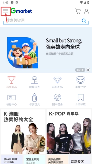 1、启动Gmarket购物应用,点击左上角的菜单图标,展开功能菜单列表。