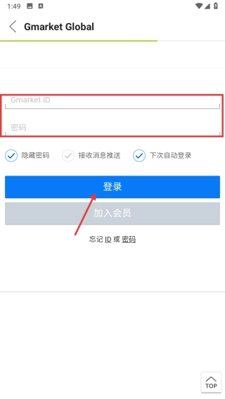 4、进入登录页面后,输入Gmarket-ID和对应的密码,接着点击登录按钮,即可完成账号的登录流程。