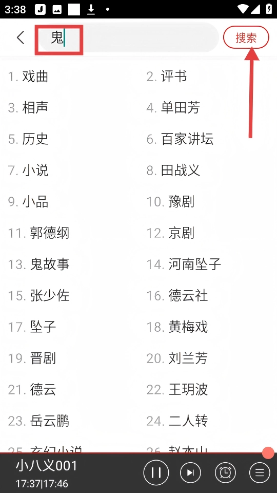 2、在搜索框中输入【鬼】字,接着点击右边的【搜索】按钮,就能找到相关的鬼故事音频内容。