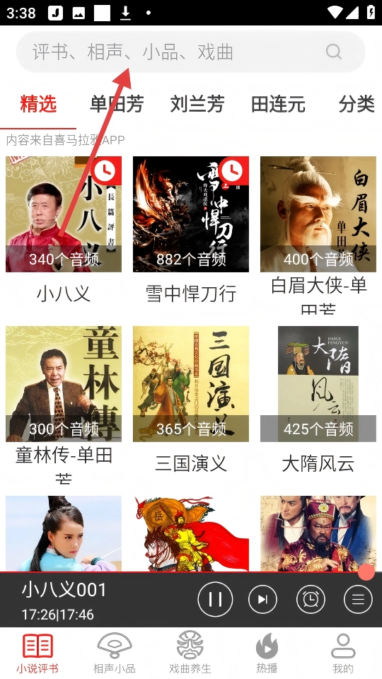在这个应用里,你可以通过顶部的【评书、相声、小品、戏曲】搜索栏来查找相关内容。