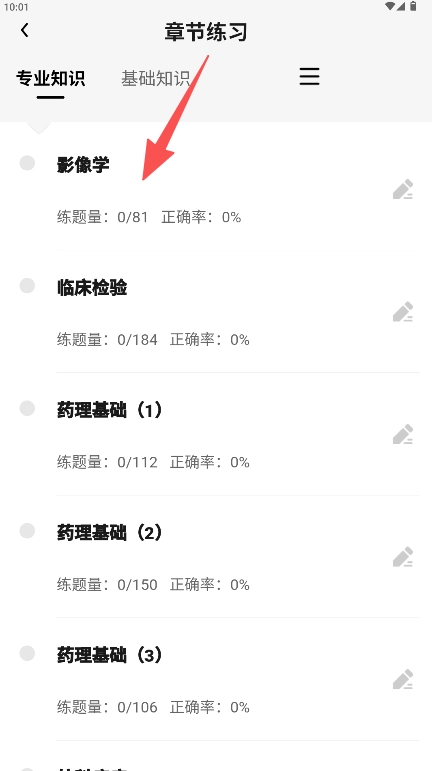 2、在科目列表中选择具体练习科目,如“影像学”。