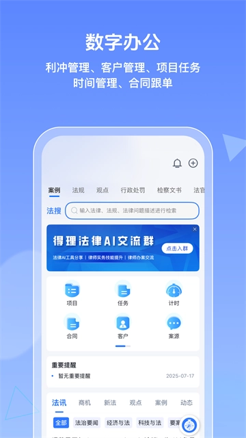 得理律助App是一款面向律师群体开发的智能法律科技应用。它整合了信息化、数字化与人工智能技术,为律师提供覆盖案源开拓、法律检索、AI辅助研究与文书生成,以及客户与项目管理、团队协作和服务优化的全流程支持方案。这款App不仅可以助力律师更高效地获取案源,还能借助AI法律助手功能提升检索、研究与合同处理的效率,同时在客户维护、任务分派、时间管控和文档协同等方面提供有力支撑,是律师专属的智能工作伙伴。