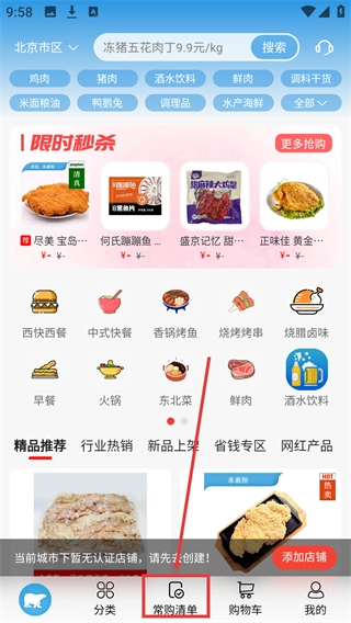 1、在界面底部找到【常购清单】按钮并点击,可进入常购清单相关页面,管理常用采购物品。