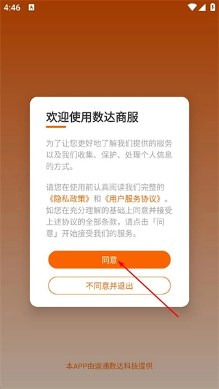 1、在欢迎使用数达商服弹窗中,点击同意,进入首页
