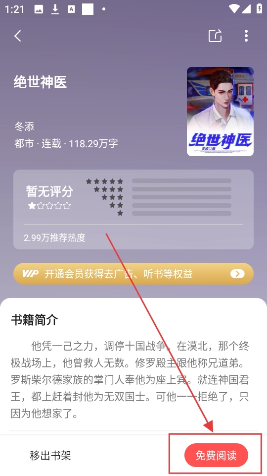 2、进入书籍详情页后,点击【免费阅读】,可进入章节阅读页面哦。