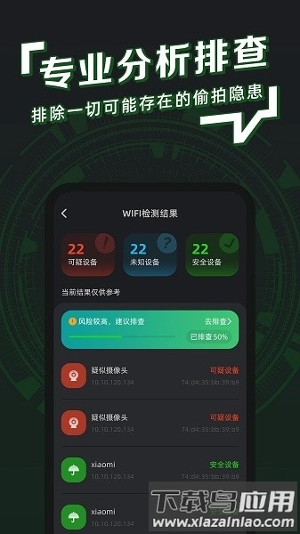 2. 安全检测:依托Wi-Fi网络和手机定位信息,可快速排查摄像头与针孔设备,同时利用庞大数据库对设备的MAC地址及IP地址展开智能比对分析。