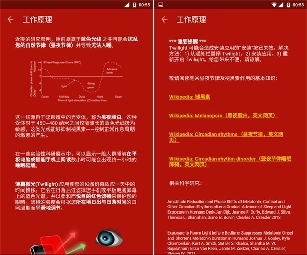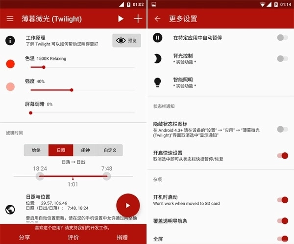 薄暮微光是一款运行于Android系统的屏幕色温调节软件,它能依据当前的时间与地理位置,自动调整手机或平板屏幕的色温,使你在夜晚光线较暗的环境下使用设备时,不会感到屏幕刺眼。