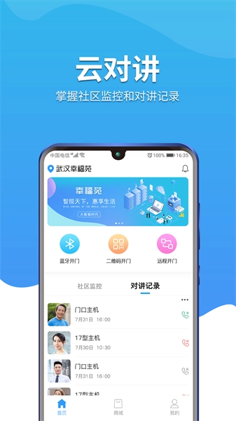 支持二维码、蓝牙、远程三种开门方式;可实时接收进出提醒,所有对讲记录均会保留以便查询。
