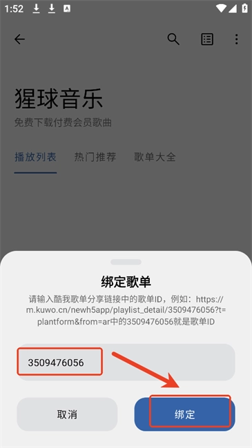2.将酷我分享链接的歌单id复制到软件中点绑定。
