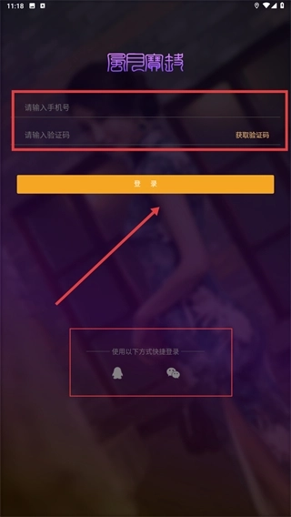 在登录页面,你可以选择填写【请输入手机号】的输入框,然后点击【获取验证码】按钮,输入收到的验证码后点击【登录】按钮完成登录;此外,还能通过【QQ】或【微信】的快捷登录方式直接登录。