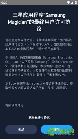 1.先安装Samsung Magician应用,安装完成后打开它,在弹出的权限请求窗口中允许所需权限,接着阅读并接受许可协议;
