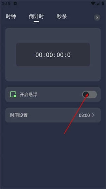3、进入倒计时界面后,找到“开启悬浮”选项旁的开关按钮并点击,就能启用悬浮倒计时功能。
