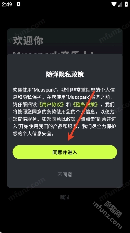 1、打开musspark软件点击同意并进入