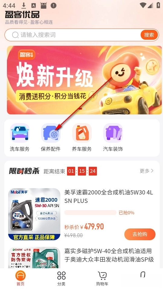 盈客优品最新版是一款聚焦汽车配件与用品的购物平台,平台内对各类商品进行了细致分类,方便用户快速定位并选购所需商品。同时,平台推出限时秒杀活动,用户可享受活动专属优惠价,以更实惠的价格入手心仪好物。商品涵盖家居百货、食品生鲜、养生保健、美容养护、保养配件、养车服务、汽车装饰等丰富品类,海量优质商品随时可供选购。所有商品均明码标价,杜绝隐形消费,在此下单养车服务更具性价比,为用户打造经济实惠的养车体验。