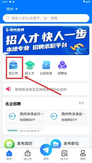 1、在【扬州直聘】首页,点击【找工作】功能入口,进入职位搜索与浏览页面。