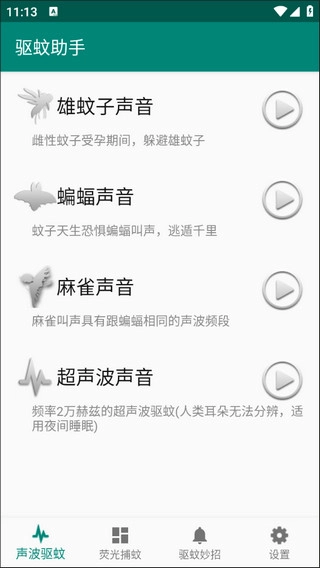 2、目前提供雄蚊子声音、蝙蝠声音、麻雀声音以及超声波这四种选项,大家都可以尝试播放体验