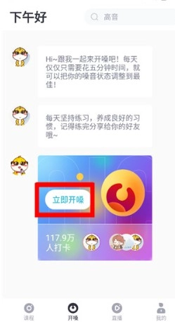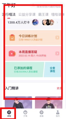 进入首页后,你可以使用浏览课程、进行开嗓练习以及参与直播教学等功能。