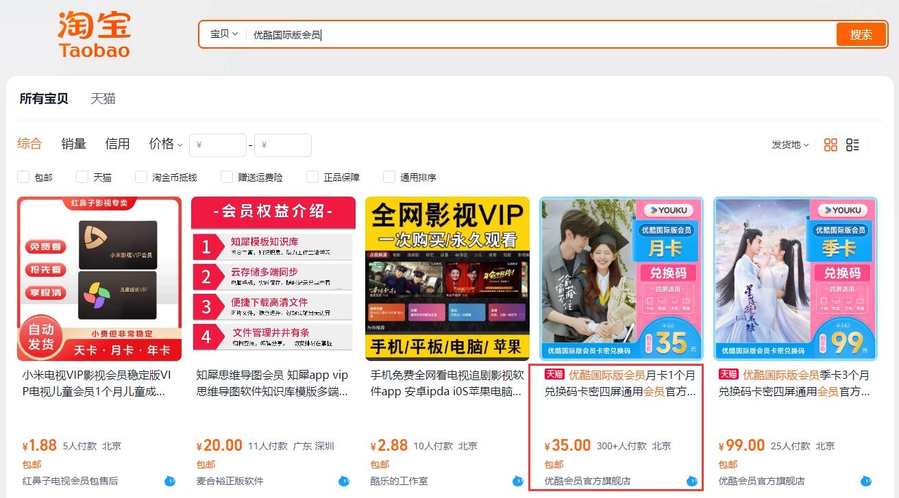 首先打开某宝,搜索“优酷国际版会员”,然后在搜索结果里找到优酷会员旗舰店的商品链接并点击进入。