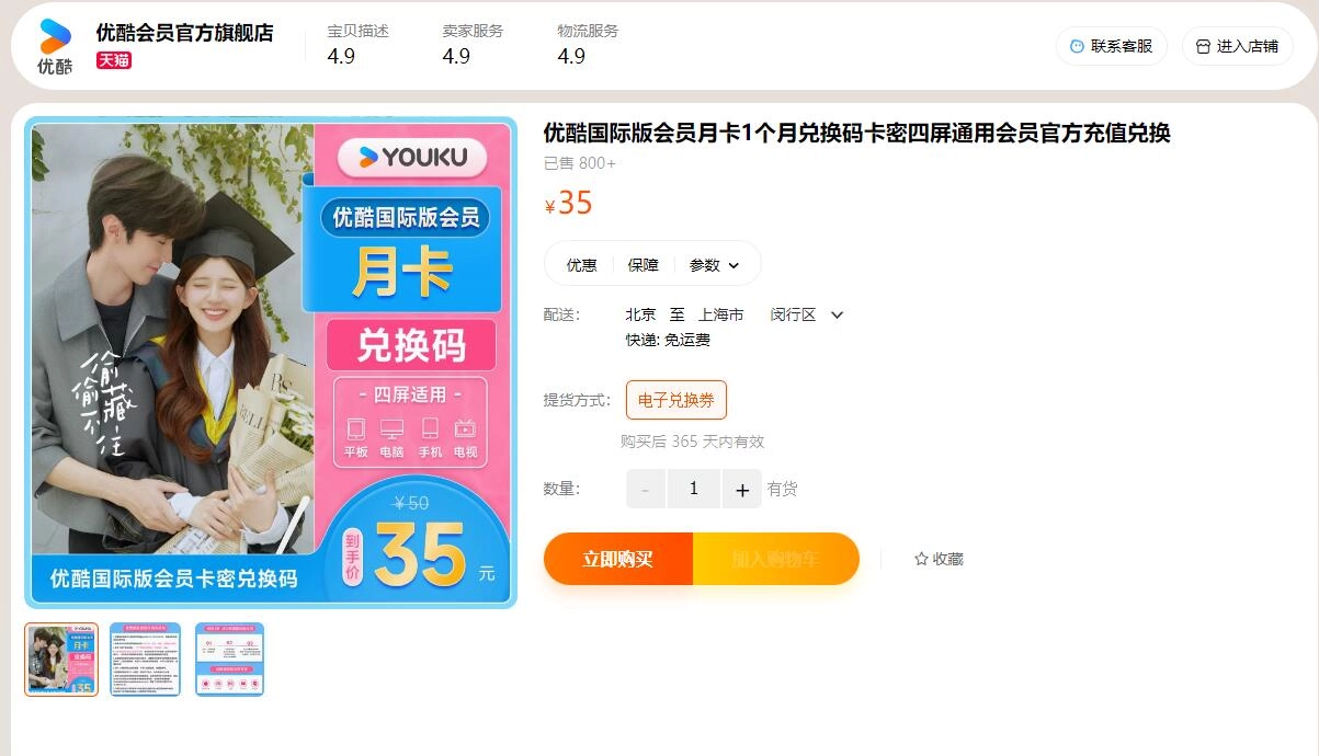 在商品详情页购买优酷国际版会员时,可选择1个月、3个月等不同时长的兑换券进行使用。