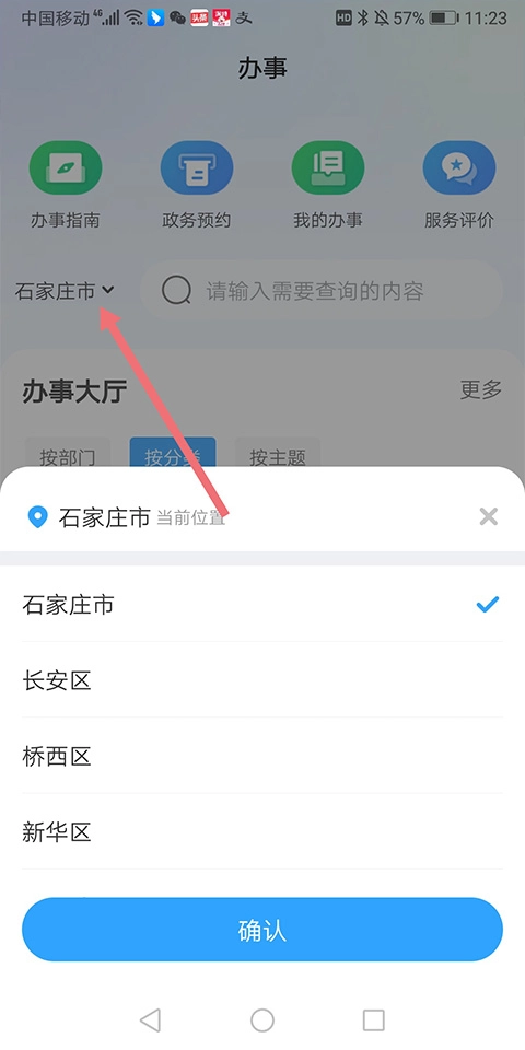 用户进入服务界面后,可点击页面上的搜索区域(即图示红色箭头指向的位置)