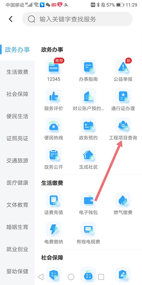 进入新打开的页面后,在政务办事分类下找到对应的工程项目查询入口并点击进入。