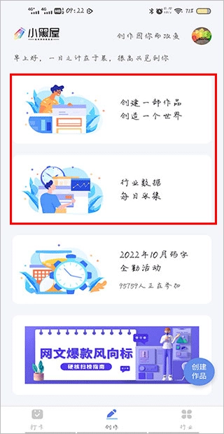 在手机上启动小黑屋云写作应用,进入到创作相关的界面后,点击界面上方的创建选项,就能开启创作的流程了。
