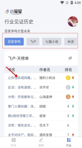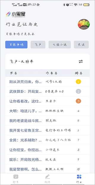 当你打开相关行业界面时,能看到涵盖了不同规模的小说阅读平台,像百家争鸣、飞卢、米读等都在其中。界面下方展示着各类榜单里的书籍名称以及对应的作者名字,用户可以依据自身喜好,挑选并阅读他人创作的作品。