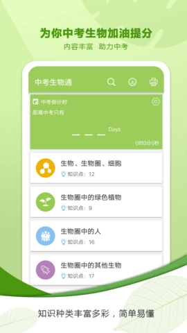 这款应用针对中考生物科目设计了专题练习题目,每道题都配有详细的讲解分析,助力学生掌握解题思路与方法。学生借助专题练习,能够有针对性地攻克薄弱环节,提升解题能力。此外,软件还具备倒计时功能,学生在首页就能看到距离中考的剩余天数,便于合理规划备考时间,时刻保持备考状态。