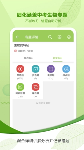 这款应用收录了全国多数省市的数百套中考真题,每道题目都配有详尽的解析,学生能借助做题来夯实知识基础,提升解题水平。此外,软件还涵盖了中考生物学科下所有知识点的细致解读,具体分为基础知识、绿色植物、生物圈中的人、生物的多样性、生物的进化、生物实验等几大板块。