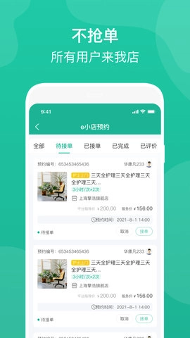 还有打保胎针、新生儿护理和产后开奶等母婴护理服务。还有陪诊陪检服务、肿瘤早期筛选、优生优育、甲状腺检查、心血管功能等疾病筛查服务以及中医理疗服务。这些上门服务的目的是为了方便患者,让他们能够在家中得到专业的护理和医疗服务。在e护通医护端中,服务人员可以根据自己的专长和执业领域进行平台角色认证。认证成功后,他们可以根据自己的工作安排进行接单设置,灵活自由地接取不同服务时间的订单。医护人员可以根据自己的时间和能力来安排工作,提高工作效率。